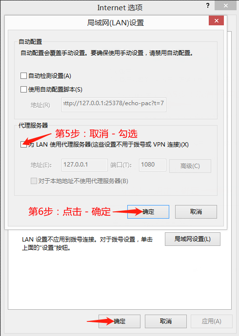 第3步:取消勾选 - 为LAN使用代理服务器,然后点击 - 确定